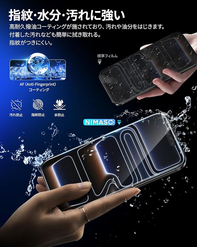 「指紋防止・滑らかな触り心地」本製品は撥水撥油のAF(Anti-Fingerprint)コーティング加工とスムーズタッチ加工により、指紋や汚れがつきにくく、油分や水分が強く付着した汚れや指紋がついても、拭き取るだけで綺麗になります。また、手触りも滑らかで、毎日の動画視聴や仕事、勉強、ゲームなどのあらゆるシーンでも、常に美しいアイホン17プロの画面をお楽しみいただけます。