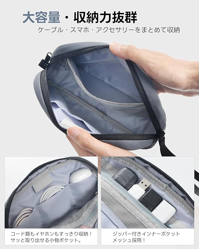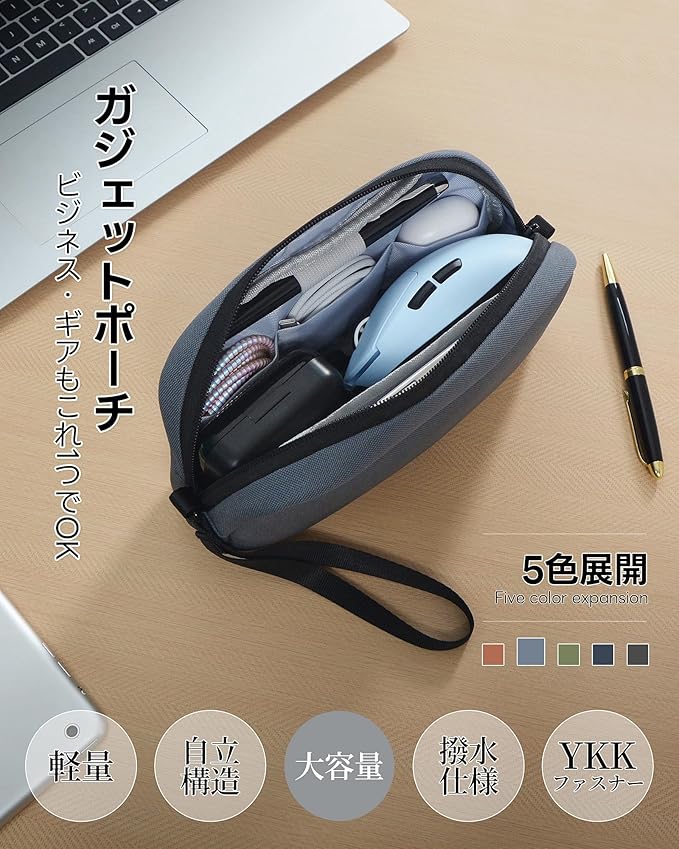 【すっきり収納で全てを一元化】 このガジェットポーチは、日々の必需品から旅行の小物までを一つの収納ポーチにまとめる理想的な小物入れです。スマホ、イヤホン、充電ケーブル、鍵、リップクリームなど、散らかりがちなアイテムをカテゴリ別に整理。自宅やオフィスでのデスク収納はもちろん、出張やレジャー時のトラベルポーチとしても活躍し、紛失リスクを最小化しながら素早い出発を実現します。
