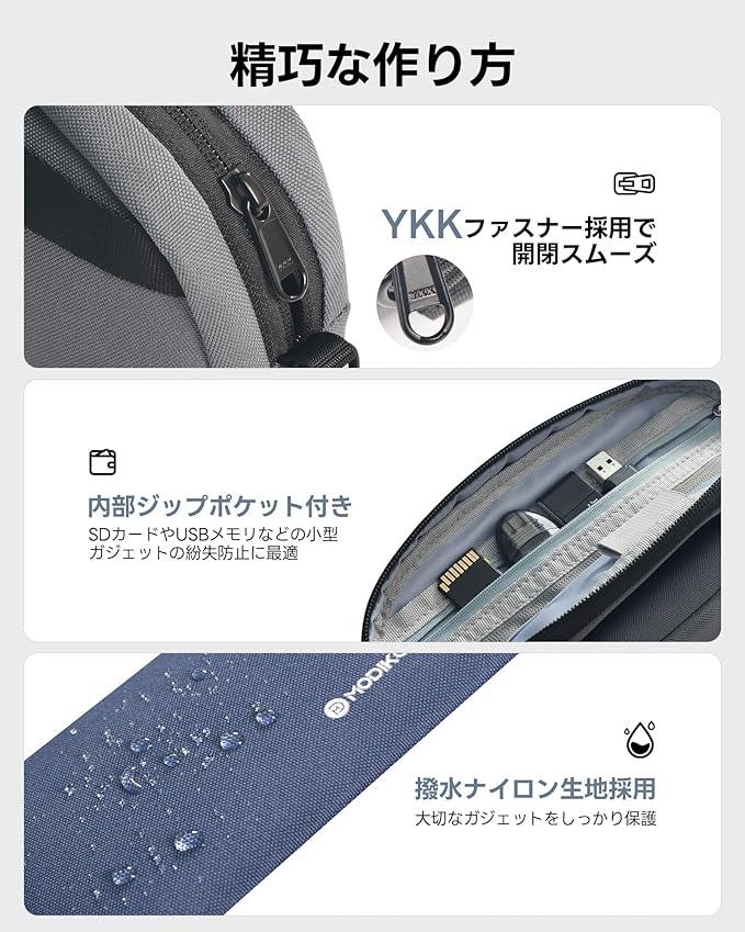 【軽量設計で携帯に最適】 重量わずか85gの超軽量素材を採用したこのポーチは、リュックサックやスーツケースに追加しても負担ゼロ。通勤ラッシュや空港移動時でも疲れ知らずの携帯性を誇り、旅行中の荷物増加を気にせずガジェットを持ち運べます。コンパクトサイズ(23 13 6cm)ながら大容量を実現し、収納ポーチとしての機能性と軽量性が、多忙な現代人のライフスタイルに最適です。