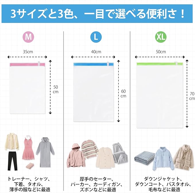 【3サイズ展開!ニーズに合わせて選べる大容量圧縮袋】さまざまなニーズに応えるために、3つのサイズをご用意しています。XLサイズ(50*70cm)は、冬のダウンジャケットやコート、毛布、そして薄手の布団など、厚手のアイテムを効率よく収納。Lサイズ(40*60cm)は、トレーナーやセーター、ズボンなどの中型アイテムをパッキングに最適。Mサイズ(35*50cm)は、下着、タオル、シャツなどの小物類をコンパクトに収納。これらのサイズは、ニーズに合わせた最適な収納ソリューションを提供し、収納スペースを最大限に活用できます。