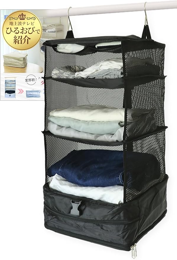 ✅【 旅先でわずか20秒セットアップ 】 旅先で パッ と広げて、 クローゼット などに吊り下げるだけ。 4段 のスペースがあり、入れた荷物もすっきり収納できます。