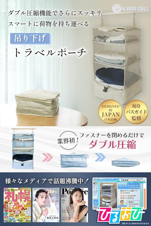 \「ひるおび」で紹介/ トラベルポーチ 吊り下げ 旅行用圧縮袋 【業界初”ダブル圧縮”でさらにコンパクト】 旅行 便利グッズ LASSE MOA