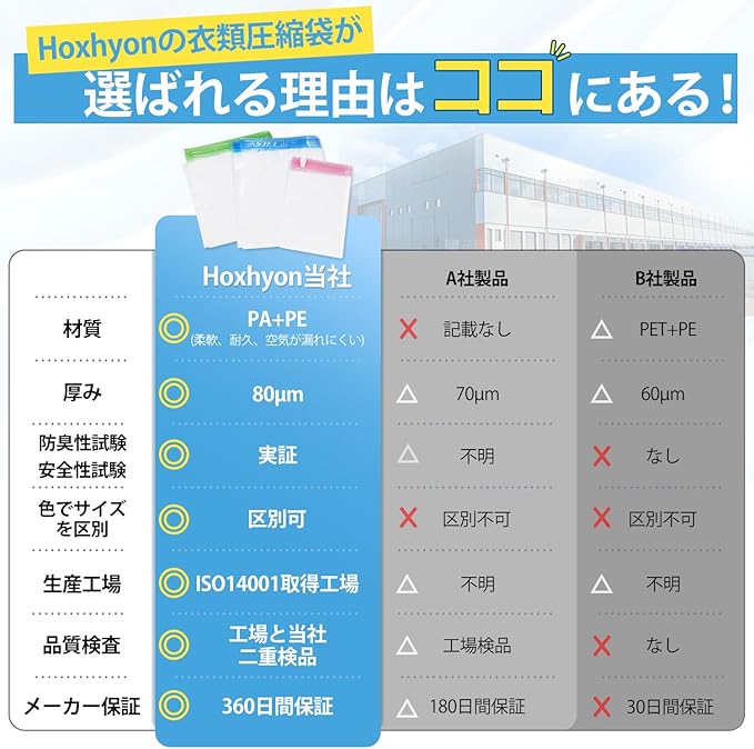 特徴 三色でサイズが一目瞭然, 掃除機不要, 真空密封, 繰り返し使用可能, 防臭性3倍UP