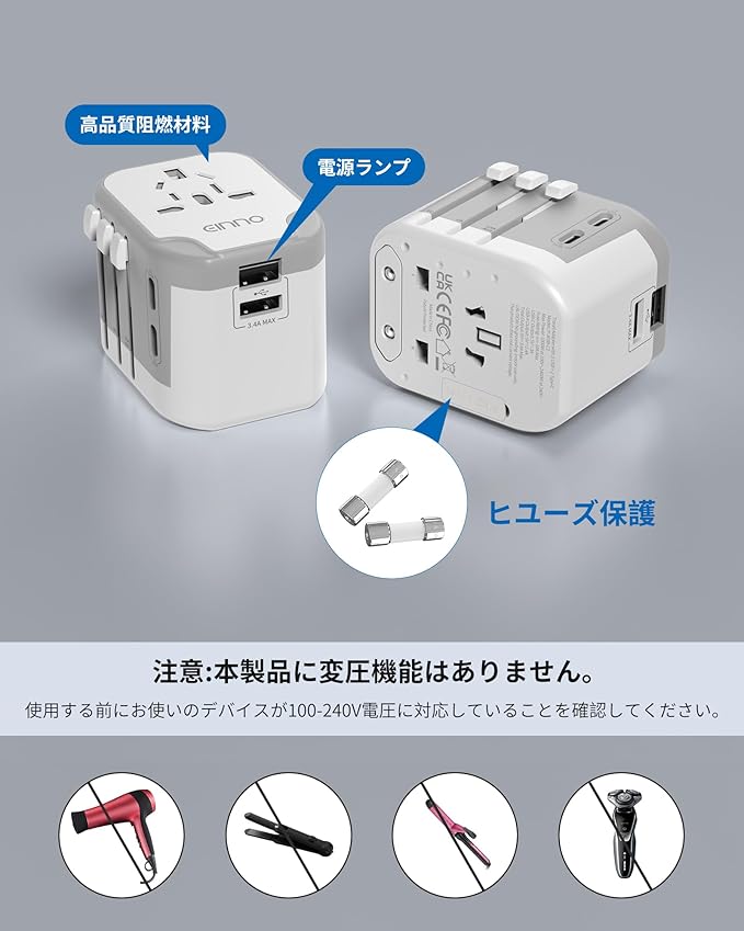 【ご注意】このアダプターは電圧変換器ではありません。日本国内仕様(AC100V)の電化製品を海外でご利用になる場合は、別途変圧器が必要となります。100-240V対応と表記の電化製品は海外仕様電化製品のため、変圧器がなくても使用可能です。ご使用の際は必ず電圧をご確認ください。また、ヒューズの最大負荷電流は10Aで、電圧100Vの国で使用の場合は最大電力100V*10A=1000W以内の電器対応で、240Vの国で使用の場合は最大電力240V*10A=2400W以内の電器を対応します。