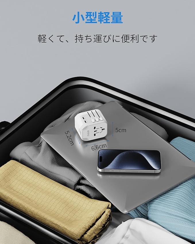 【安全 コンパクト】コンセント変換器は過充電、過放電、過電力、過熱保護、過負荷などの防災機能があります。耐熱や変形しない材料を使用し。また、電源変換プラグには一つの予備の10Aヒューズが含まれていて、充電の安全性を保障して。製品のサイズは6.6 x 5.2 x 5.0cm、約120gの重量です。コンパクトで軽くて、持ち運びに便利です。海外旅行、出張、研修などに適用します。