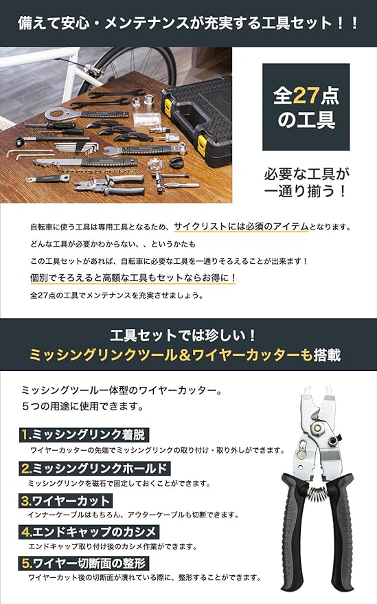 ♂️【初心者から玄人にも対応したセット内容】自転車 メンテナンスには専用の工具が必須となります。ペダルレンチ、スプロケット外し、チェーンカッターなどの様々なパーツや用途に対応した自転車用ツールが全27点。携帯しておくと安心なパンク修理キットやタイヤレバーも付属しています。