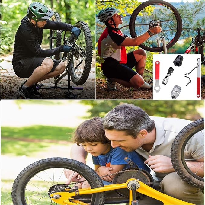 【 自転車修理に必要な工具】パンク対策としての自転車用修復工具セットです。チェーンを切るためのチェーンカッター、コッタレスを抜くプルツール、BBツールのセンターシャフトスリーブ、ボスフリーを抜くフライホイールスリーブ、16mmモンキーレンチ、フリーホイールリムーバーの5種類です。自転車工具、緊急パンクを処理するの快速実用な修理セット。自転車のチェーンやタイヤやギアの調整に役立ちます!また、趣味のロードバイクやマウンテンバイクの整備にもバッチリです!自分仕様にマルチに調整できるので、快適なツーリングが楽しめます。