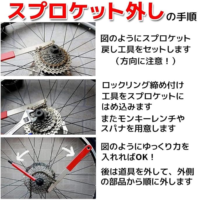 【16mmモンキーレンチ】16mmモンキーレンチと合わせて使用して無事にクランクを外せることができます。耐久性、損傷しにくい、長時間使用できます!自転車の歯盤の取り外し、トップの延長、口和スプラインの取り外しができます。【フリーホイールリムーバー】炭素鋼製また。使用中に偏りの問題を避けるためにフリーホイールリムーバーの真ん中に中央ガイドを付きました。使用時に、別途モンキーレンチ、スプロケット抜きツール等の工具が必要です。注意な点は差込角度に応じて異なるレンチサイズを使用してください。これは滑り止めが施されたオレンジのコーティングハンドルで快適性と使いやすさを実現しています。スプロケット外すの場合には思い切り力をかけて滑らないように役に立つ。