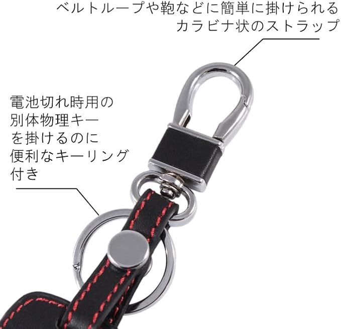 カラビナ付きのため、そのままベルトループやバッグなどに取り付け可能。ブラックレザー レッドステッチの高級感溢れる造り。