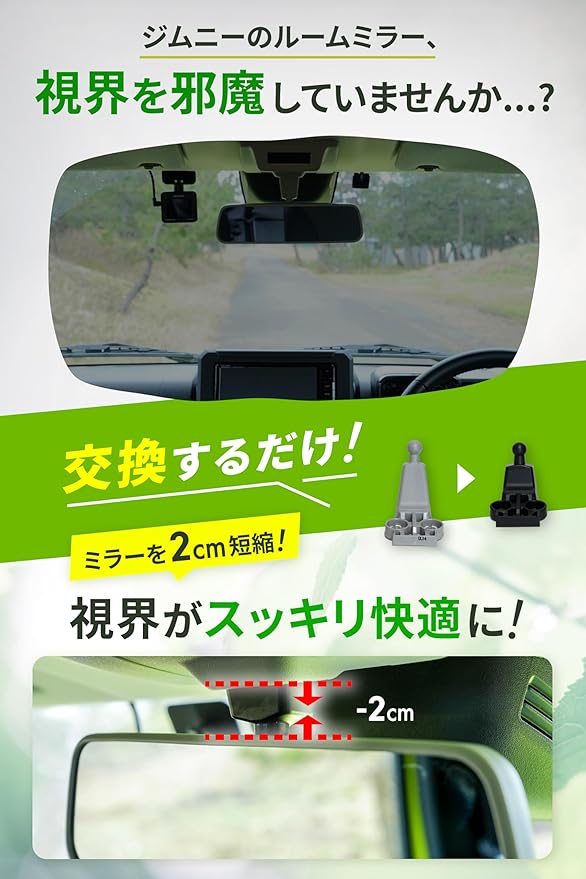 \たった2cmで意外と変わる視界/ ジムニーJB64の邪魔なルームミラー位置を2cm高くして視界を向上できます。取付も簡単で全てのジムニーオーナーにおすすめのカスタムパーツです。 「ジムニー用ショートミラーステー」は、ジムニーの運転をさらに快適にするために設計された専用のカスタムパーツです。ルームミラーの長さを5cmから3cmに短縮することで、運転時の視界を広げ、車内をより広く感じられるようにします。視界の改善はもちろん、カスタムとしてもスタイリッシュで、日常の街乗りやアウトドアシーンにおいてもジムニーをより使いやすくする便利グッズです。