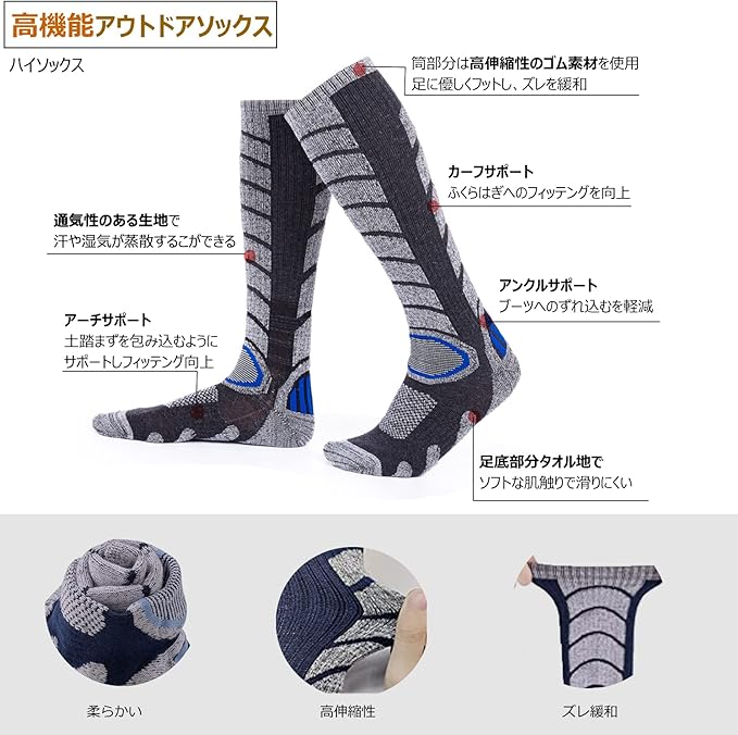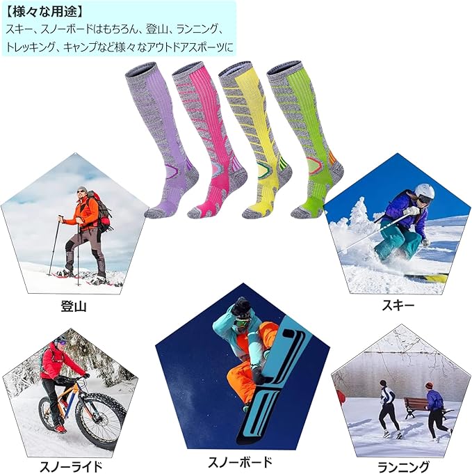 ★★【様々な用途】★★スキー、スノーボードはもちろん、登山、ランニング、釣り、バイク、サイクリング、トレッキング、キャンプなど様々なウィンタースアウトドアスポーツに幅広くご使用いただけます。寒い天気での通勤、通学、旅行、屋外作業などにも最適な厚手アウトドア ハイソックスです。