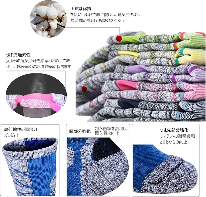 ★★【クッション性&通気性】指先部、踵部は厚めのパイル編みでクッション性を高め、着地の衝撃を弱め、つかれを和らげます。踵に摩擦防止設計で怪我を防ぐ機能として優れています。通常の靴下よりも重荷で歩きやすく疲れにくくなっています。通気性のある生地で汗や湿気が蒸散するこができます。