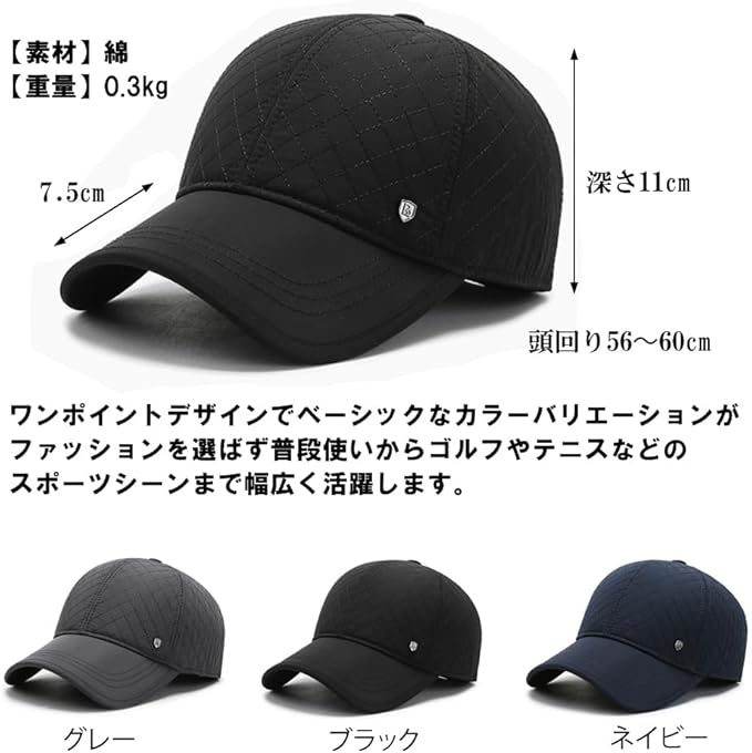 【素材】綿【カラー】ブラック、ネイビー、グレー 【サイズ】ツバ長さ7.5cm 深さ11cm 頭回り56⁻60cm 【重量】0.3kg