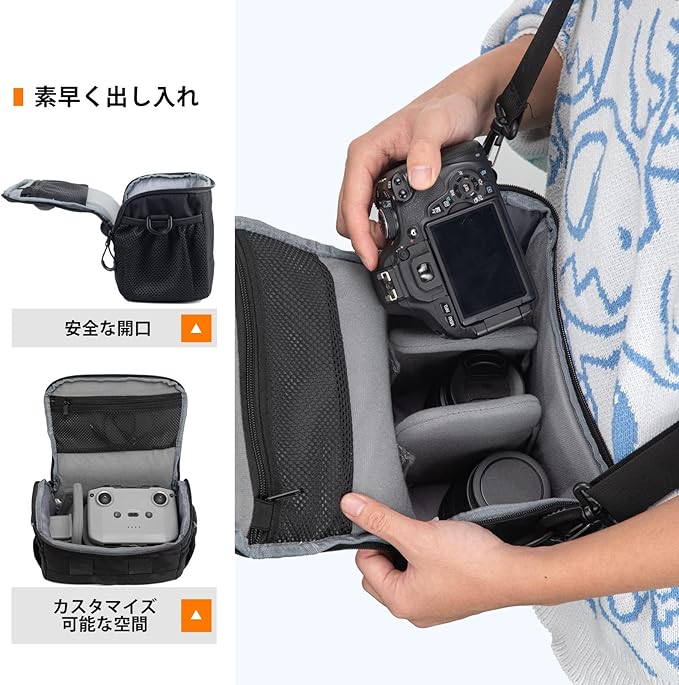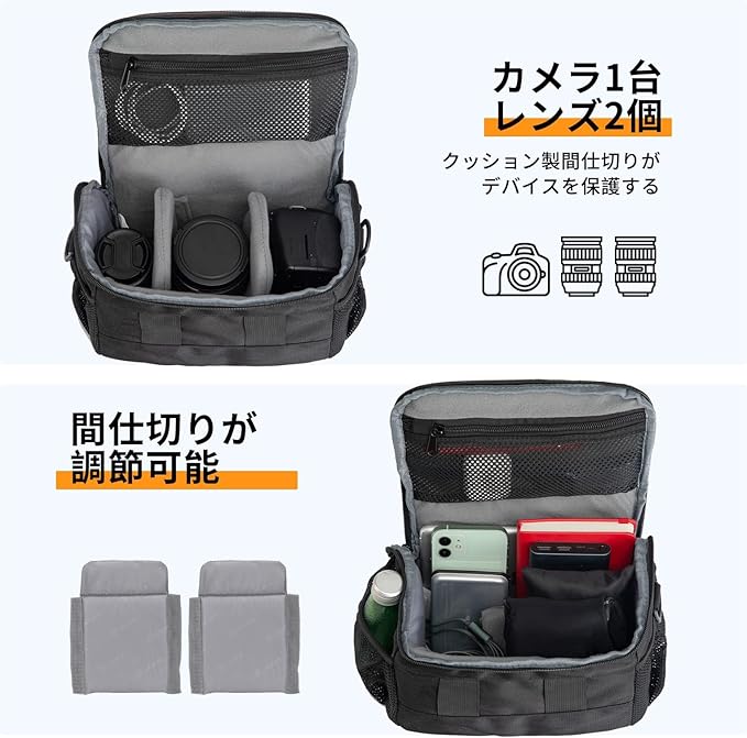 【フレキシブルな内部収納】25*14*17cm、350g、5L 移動可能な間仕切り板が付いており、カメラやレンズのサイズに合わせて調節できるカメラショルダーバッグです。カメラ1台とレンズ2本を収納可能.