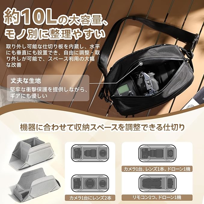 【10Lの大容量】ジップポケットが3個、メイン収納の中はポケットが1個、内部メッシュポケットが1個、追跡装置用隠しポケットが1個の合計6個の収納部で荷物が整理整頓しやすい。モバイルハードドライブ、SDカード、カメラバッテリーを収納できます。散らばりがちな小物アイテムや鍵などをきっちりと整理することができ、小物がバッグの中で迷子にならないので、欲しい物がすぐに取り出せます。取り外し可能な仕切り板をカメラレンズ、ドローンなどを収納することができます。撮影、ビジネス、出張、通勤、旅行、休暇等様々なシーンで使えるマルチガジェットポーチです。