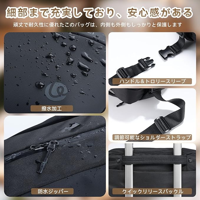【撥水加工&止水ジッパー】撥水加工で、優れた防水素材がバッグ中身の電子製品やPC周辺小物を守ってくれます。水をかけても浸み込まずに表面を転がり落ちるので、突然の雨にも安心です。高品質のジッパーは、防水設計だけでなく、長時間の引っ張りにも耐えられます。ゴソゴソせずに簡単にアイテムにアクセスすることができます。キャンプや海辺など、アウトドアでハードに使う機会がある場合にも、雨や雪の日にも、この多機能防水バッグのを選んでおくと安心です!*完全防水ではありません。強い雨の日などは縫製部分から浸水する恐れもありますのでご注意ください。