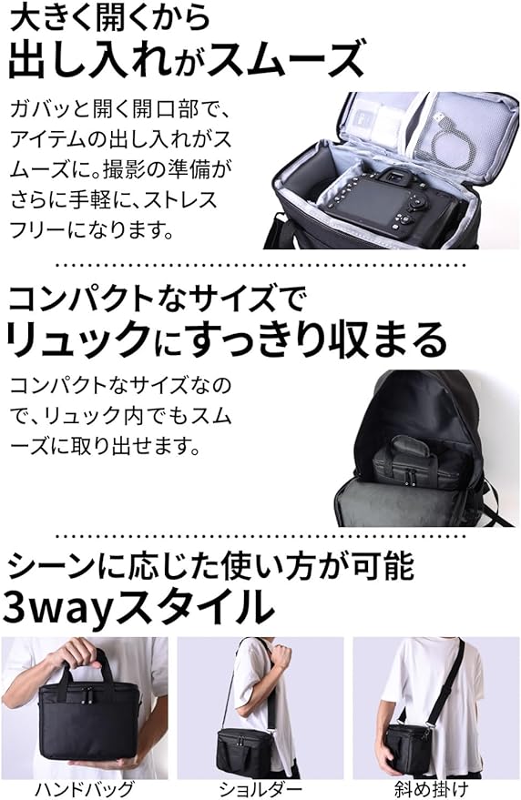 【 スムーズな出し入れで撮影の手軽さが上がる 】 ガバッと開く開口部で、アイテムの出し入れがスムーズに。撮影の準備がさらに手軽に、ストレスフリーになります。コンパクトなサイズでリュックにすっきり収まり、リュック内でもスムーズに取り出せます。ハンドバッグ、ショルダー、斜め掛けの3WAYスタイルで、シーンに応じた使い方が可能です。