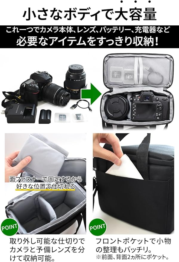 【 小さなボディで大容量 】これ一つでカメラ本体、レンズ、バッテリー、充電器など、必要なアイテムをすっきり収納。コンパクトながら大容量を実現しています。取り外し可能な仕切りでカメラと予備レンズを分けて収納可能でき、フロントポケットで小物の整理もバッチリ。撮影の準備がスムーズに、どこへでも気軽に持ち運べます。