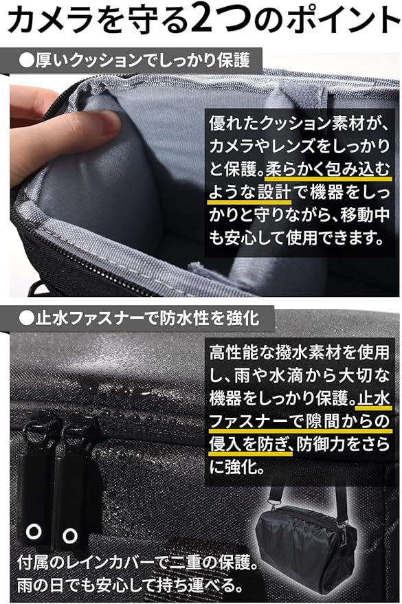 【 止水ファスナーで防水性を強化 】高性能な撥水素材を使用し、雨や水滴から大切な機器をしっかり保護。止水ファスナーで隙間からの侵入を防ぎ、防御力をさらに強化しています。加えて、付属のレインカバーで二重の保護を実現。雨の日でも安心して持ち運べる、信頼のバッグです。