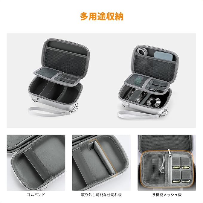 【自由に多機能収納】デジタルカメラケースの内部には取り外し可能な仕切り板にありますので、設備の大きさによって自由組み合わせ可能です。メッシュポケットは収納スペースを拡大し、ケーブル、SDカードなどアクセサリーもちゃんと保護できます。