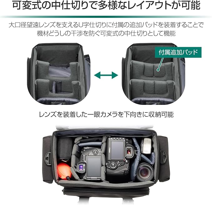 可変式の中仕切りにより多様な機材の収納に対応し、70-200mm F2.8クラスの望遠レンズを装着した一眼カメラをそのまま横向きで収納できるほか、レンズ付きの一眼カメラを下向きに2台収納することも可能。