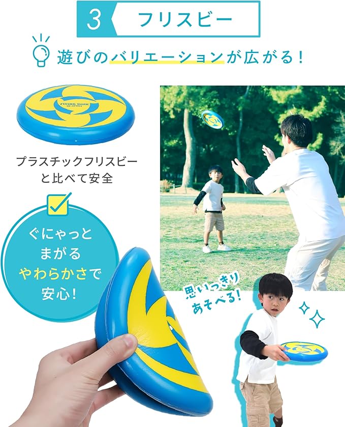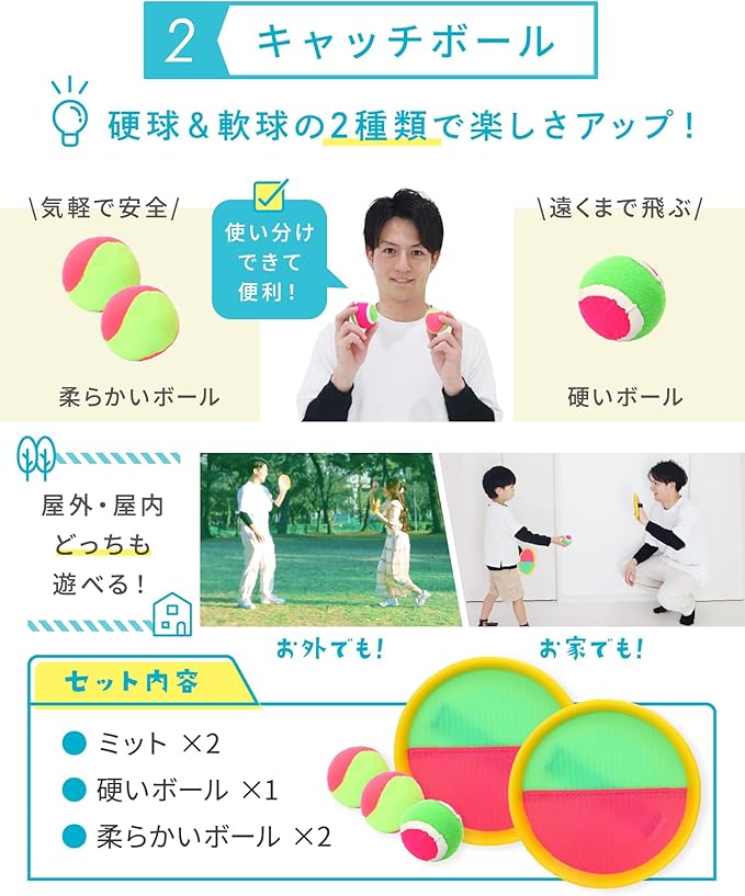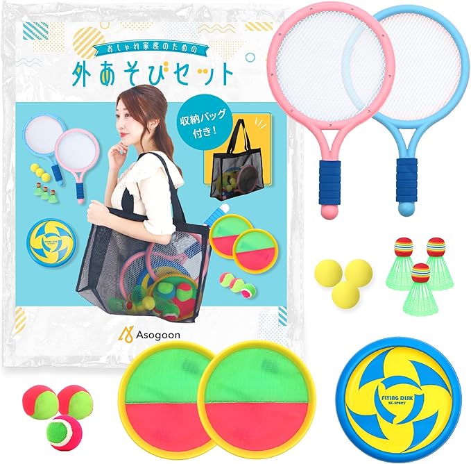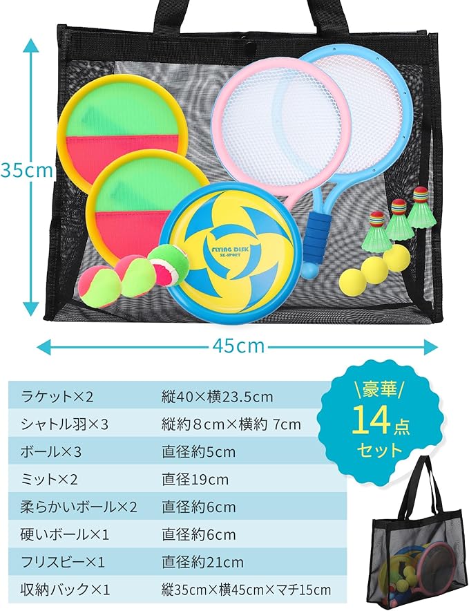 商品仕様(豪華14点セット!) ✅ ミニラケット 2本 ・サイズ:縦40cm 横23.5cm ・軽量&太めグリップで小さなお子様でも握りやすい! ✅シャトル羽根 3個 ・サイズ:縦約8cm 横約7cm ・屋外でも飛びやすく、丈夫なつくり。 ✅ソフトボール 3個 ・サイズ:約5cm ・当たっても痛くない柔らか素材。公園遊びに最適! ✅ キャッチボールセット 2個 ・長さ19cm(裏面に調整ベルト付き) ・年齢に合わせてしっかりフィット。親子でも楽しめる! ✅硬球ボール 1個 / 軟球ボール 1個 ・サイズ:約6cm ・硬さの違う2種類のボールで、年齢や好みに合わせて使い分け可能。 ✅フリスビー 1個 サイズ:直径21cm ✅ 収納メッシュバッグ 1個 ・サイズ:縦45cm 横35cm 幅15cm ・雨の日やプールでも使いやすい!通気性&収納力バツグンのマザーズバッグ仕様。