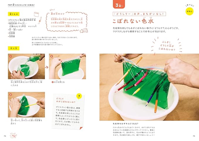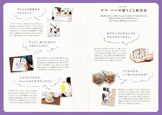 はさみの練習ステップや、絵の具遊びのスタートガイド、遊びをスパッと終わらせるコツなど、パパ&ママの「困りごと」が減るアイデアも満載!子どもの持っている力をもっともっと伸ばしたい、子どものポテンシャルを引き出したいと考えている方にぴったりの1冊です。