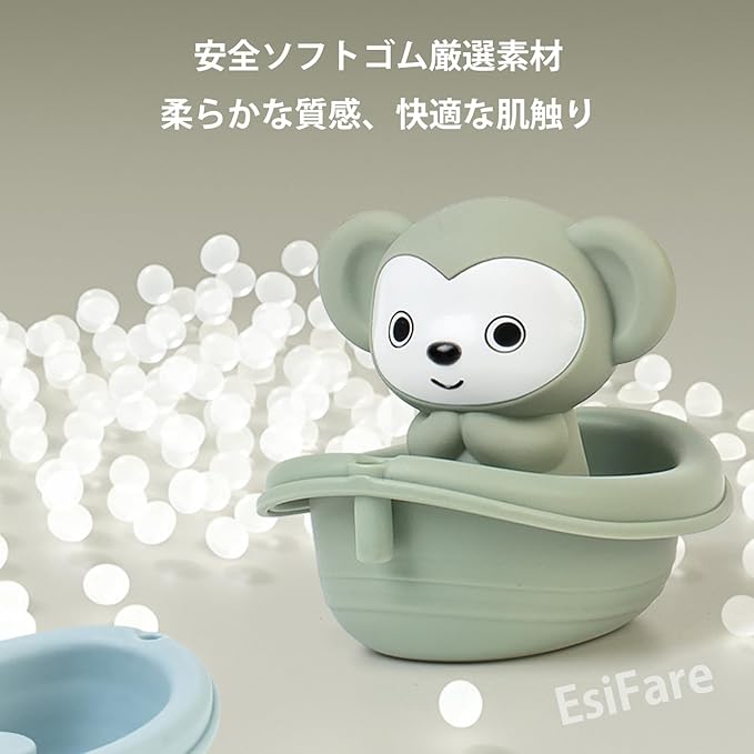 【製品の詳細】セット内容:お風呂おもちゃ動物(象+サル+狐)3個と船3個 素材:柔らかいプラスチック。 防水・防湿素材なので、長時間水に浸しても変形や色褪せしません。