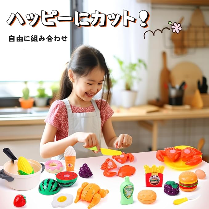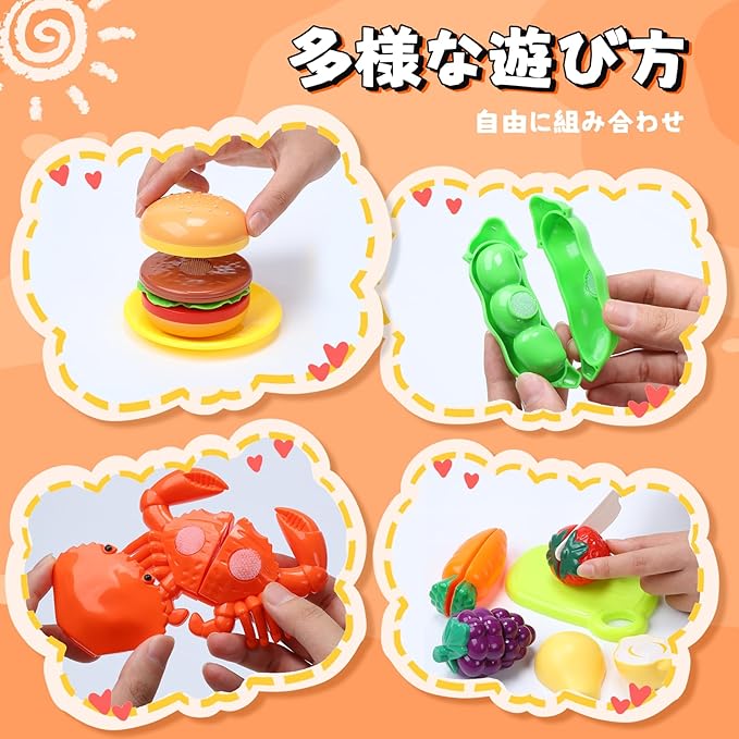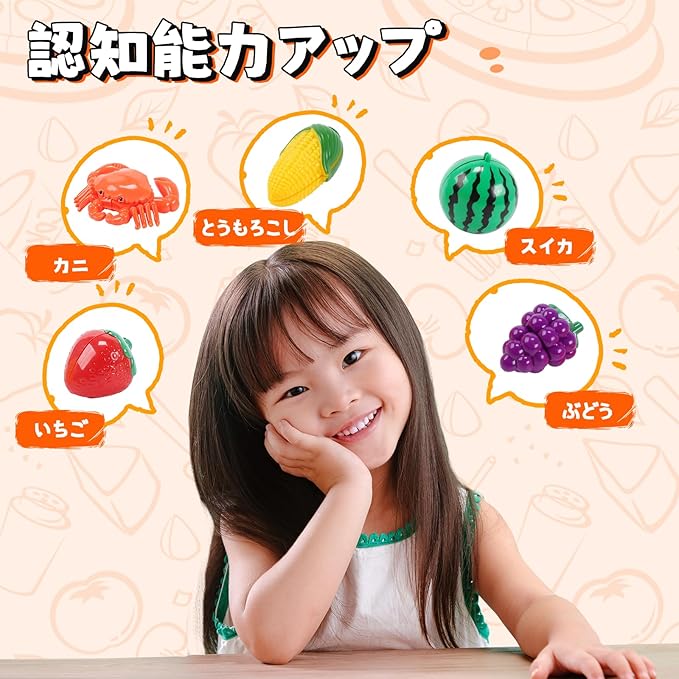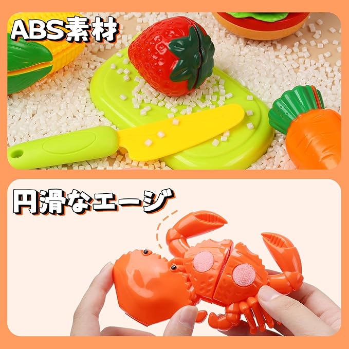 【切る遊び】このセットには、切れる・剥ける果物、野菜と食材が含まれており、本格的な切り込み音を出しながら、子供たちが食材を切ったり、調理したりするリアルな体験を楽しむことができます。また、果物の皮を剥くこともでき、実際の調理と同じような体験ができます。