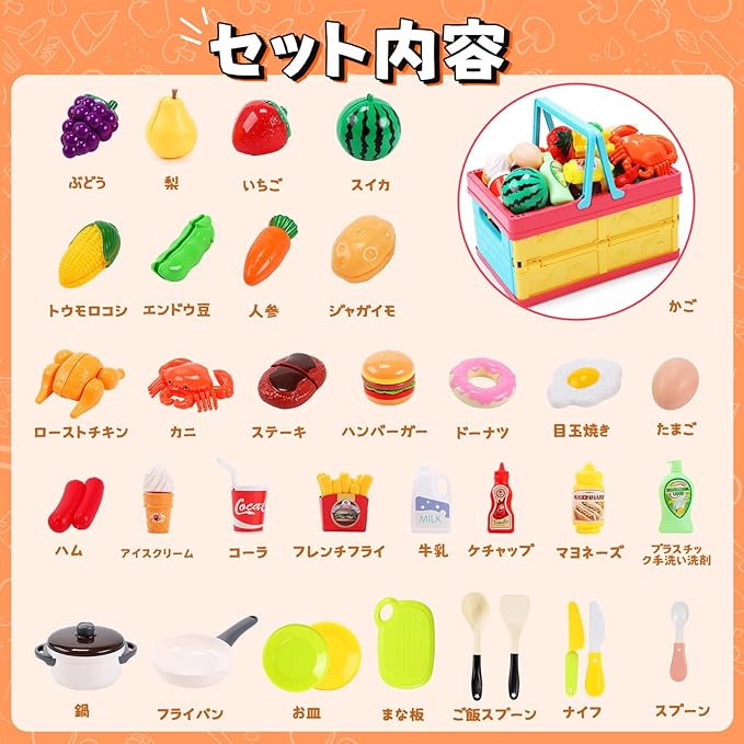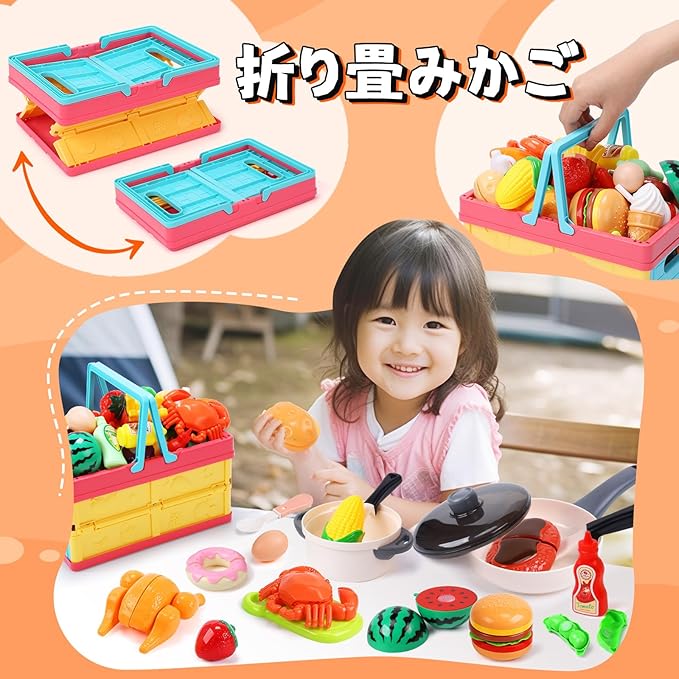 【折り畳みかご付き】このおままごとセットには、折り畳みかごが付属しています。コンパクトで持ち運びに便利です。また、このかごは、高品質の素材で作られており、頑丈で耐久性に優れています。子供たちが持ち運びやすいサイズ感で、楽しくごっこ遊びができます。買い物に行く際にも持ち運びができます。