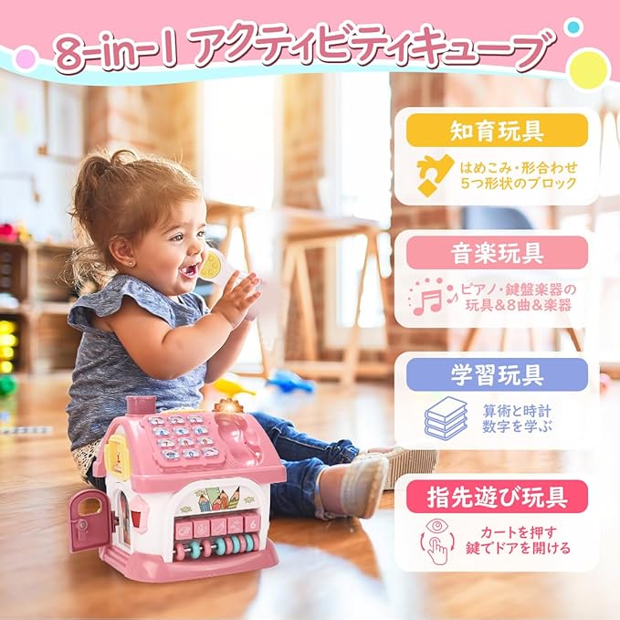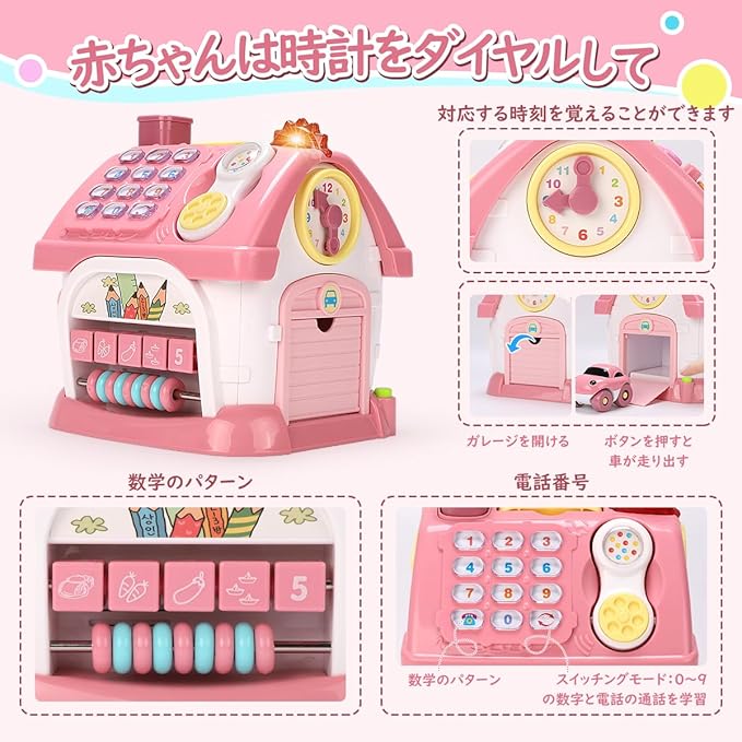 8 in1豊富な遊びの知育玩具:1.電子ピアノ 2.煙突を押すと窓が開く 3.ABCのボタ 4.鍵で開けるドア5.電話のダイヤルと受話器 6.算数あそび 7.時計の針 8.飛び出す車。 八面それぞれに異なる遊び方があり、飽きずに長く遊べます。カラフルなデザインで子どもの興味を引き、指先の発達にも役立ちます。ピンクハウスのデザインもとても可愛く、見た目でも楽しめます。0歳から遊べて、手指の細かい動きのトレーニングにもなります。