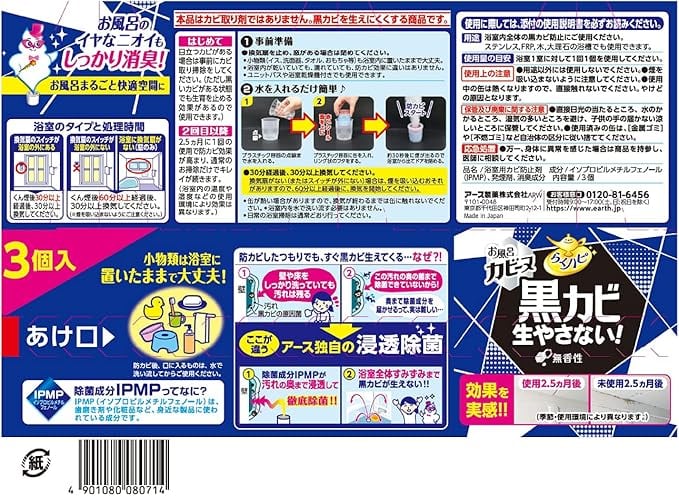 ・そこで、【ここが違うアース独自の浸透除菌】除菌成分IPMPが汚れの奥まで浸透して徹底除菌。浴室全体すみずみまで黒カビを生やしません。※全ての菌を除菌するわけではありません。