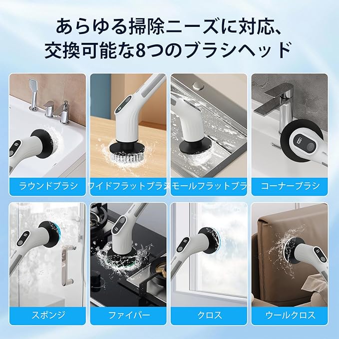 電動お掃除ブラシ バスポリッシャー お風呂掃除 ブラシ 長さ伸縮可能 手持ち式 IPX7防水 8種類の多機能ブラシ付 大容量4000mAhバッテリー 残量表示機能付き 軽量 コードレス 浴槽磨き 車掃除 トイレ掃除 床 窓 壁 玄関掃除 年末大掃除