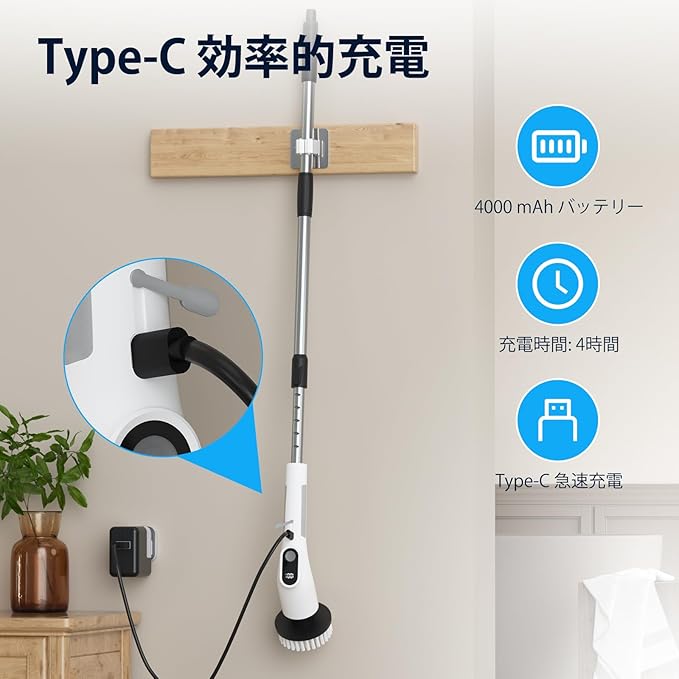 【長時間の清掃に役立つ大容量バッテリー】当社の電動スクラバーは4000mAhの大容量バッテリーを搭載し、最大90分間の連続使用が可能です。浴室、キッチン、床のお手入れなど、日常のあらゆる清掃ニーズに応え、電池切れの心配なく作業を完了できます