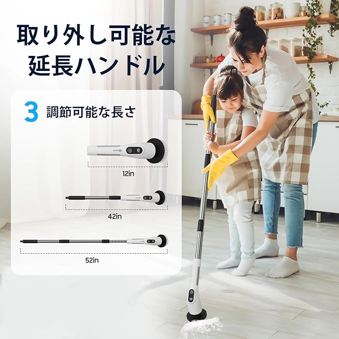 【快適な操作を実現する調整可能な伸縮ハンドル】伸縮式ハンドルを採用しているため、様々な清掃場景に柔軟に対応。中腰の姿勢になる必要がなく、浴室や高い場所の作業も楽に行えます。