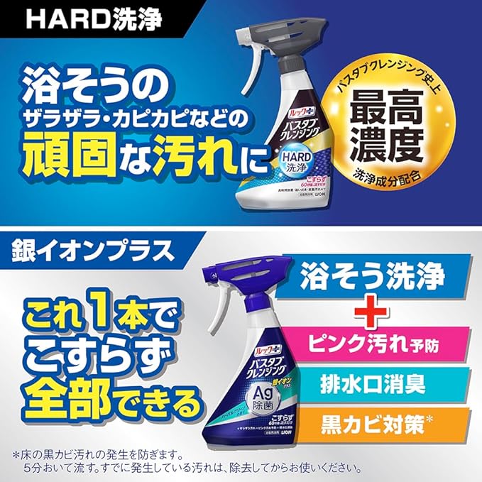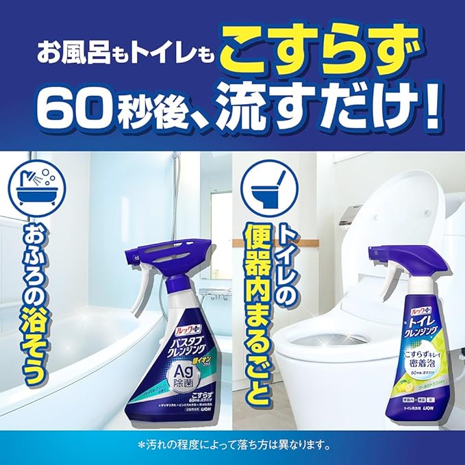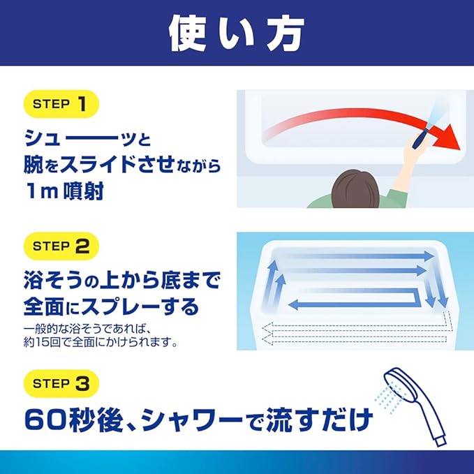 ●浴そうにシューーーッとかけて60秒後に流すだけで、翌日までお湯を放置したザラザラ汚れや、湯抜き後時間が経ったカピカピ汚れ、くり返し入浴のたっぷり汚れなど、頑固汚れもこすらずに洗える。
