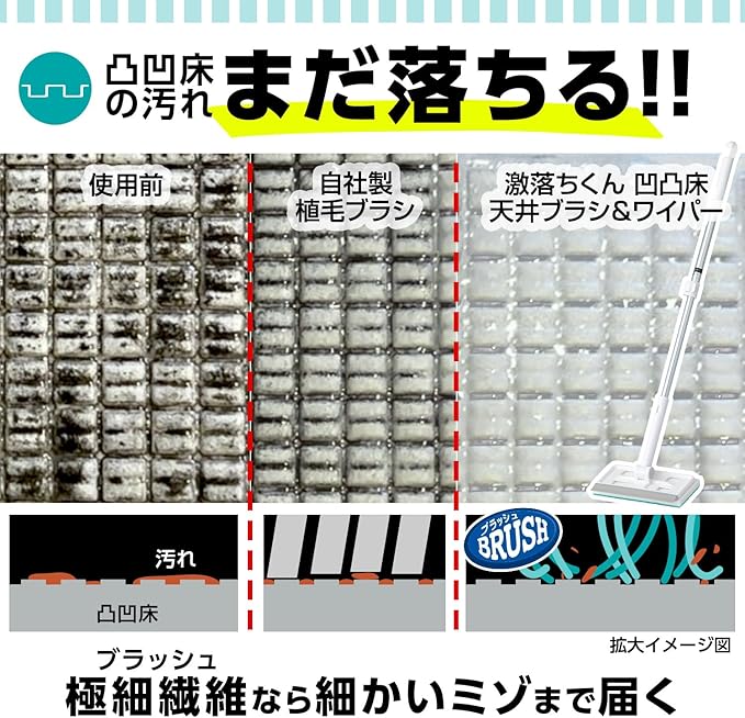 密集した極細ブラシが、浴室の凸凹床の細かい溝に届いて汚れ・黒ずみを落とします。