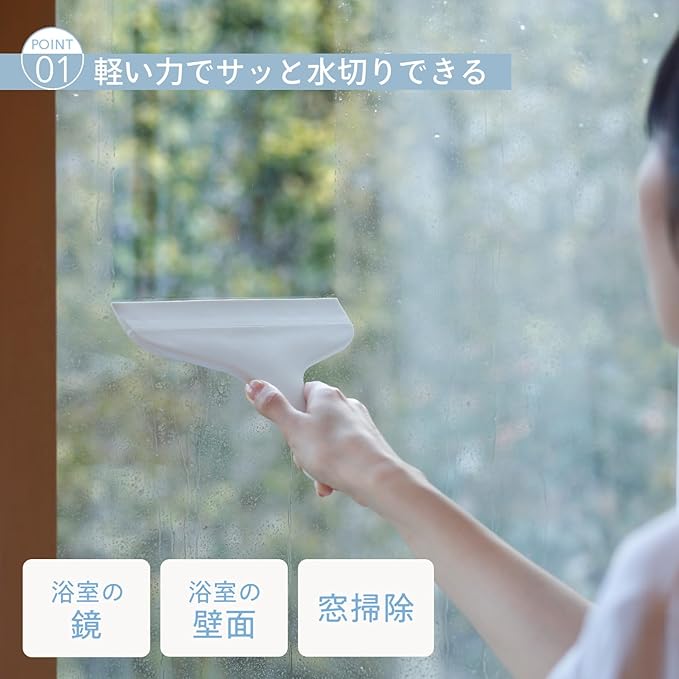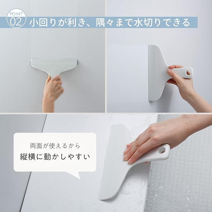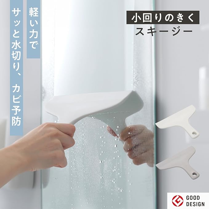 【浴室のカビ予防に】GOOD DESIGN賞受賞(※)。軽い力でサッと水切りできて両面使える縦横どちらにも動かしやすいスキージーです。小回りが利いて、浴室のすみずみまで水切りできます。窓掃除にもおすすめです。※2018年受賞
