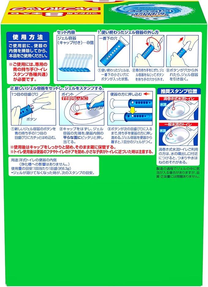 商品紹介 トイレ洗浄剤 付替え用 業務用パック(8本入り 1箱)48スタンプ分トイレスタンプ。スタンプするだけで、流すたびにピッカピカ。●トイレの水を流す度に、スタンプした濃縮ジェルが水たまりからフチ裏までしっかり洗浄。●菌汚れ防止シリーズ。菌が潜む汚れを防ぐ。●防汚コーティングで汚れがつきにくく、使用後もピカピカ。●マラゴニー効果によって便器の内側に一箇所スタンプするだけで、トイレの水を流すたびに濃縮ジェルから洗浄・防汚成分が溶け出し全体に広がります。●どんなタイプの洋式トイレにも使えます。●フレッシュソープの香り※使用には専用のハンドルが必要です。 原材料・成分 界面活性剤(32% ポリオキシエチレンアルキルエーテル)、溶剤、香料 使用方法 1.ジェル容器のボタンを別売の本体持ち手の1つ目の目盛(穴)にカチッとはめ込む。2.キャップをはずし、ジェル容器の先端を、便器内側の平らな面にピッタリと押し当てる。3.便器へ押し当てたまま、ボタンを持ち手の穴に強く押し込みながら、次の目盛(穴)に入るまで、持ち手を便器の方に押し進める4.ジェル容器を便器から離すと、1回分のジェルがつく。あとは、トイレ用芳香洗浄剤のように、トイレの水を流すだけでOK! 続きを見る