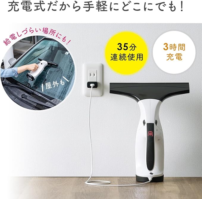 電動で水滴をぐんぐん吸い取るので、結露とりにも最適です。コードレス(充電式)なので、場所を選ばず使用することができます。