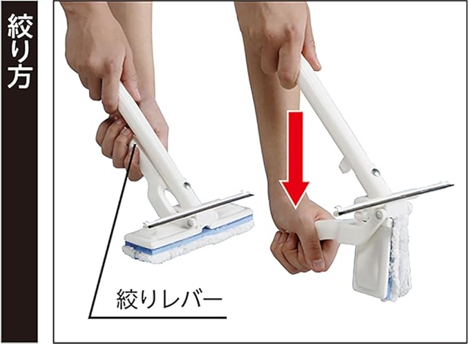 【手を汚さずお掃除】拭き幅は約18cm。他の窓用ワイパーに比べて小さ目ですが、その分フィット性がいいので均一にお掃除できます。また、通常の丸型バケツに入るサイズなので、モップの洗浄も簡単にできます。 絞りレバーを引き下げるだけでモップのスミまで手を汚さず一気に絞れます。