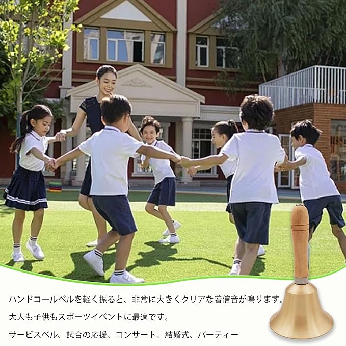 【手振りベル】精巧に作られたハンドベルです。シンプルなデザイン、きれいな音色、見た目がおしゃれです。ハンドベルとしてもご使用でき、楽器としても使えます。 【高品質】高品質の銅と木製のハンドベルは光沢があり、研磨仕上げ、色褪せにくく、耐久性があります。快適で握りやすいこのハンドベルはとても魅力的です。【操作が簡単】使い方は簡単、鐘を繰り返し振るだけで、ベルが大きくはっきりとした音を出してくれます。夕食、クラス、ゲーム、ペットのトレーニング、誰かの目覚めなどのベルとしてもオススメ。 【用途が広い】レストラン、ホテル、店舗などでの呼び出しベルとして使用できます。くじ引き、抽選会、行事、子ども会、大当たり、お祭りなどのイベントにも大活躍です。 【セット内容】手振りベル1個入っています。サイズ:約8cm 15cm。伝統的なハンドベルは、ご家族やご友人へのプレゼントにも最適です。