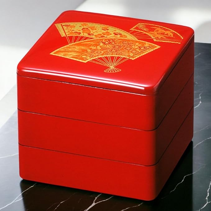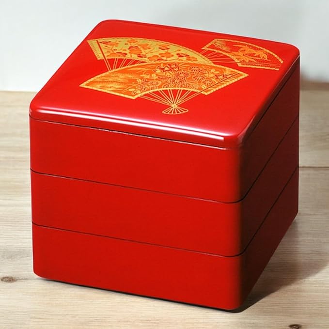 J-kitchens 漆器 重箱 3段 6.5寸 重用 朱扇面松竹梅 19cm 樹脂製 お重 お重箱 日本製