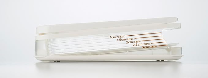 ●12枚切(1cm)、8枚切(1.5cm)、6枚切(2cm)、5枚切(2.5cm)、4枚切(3cm)。5段階の厚さの調節ができます