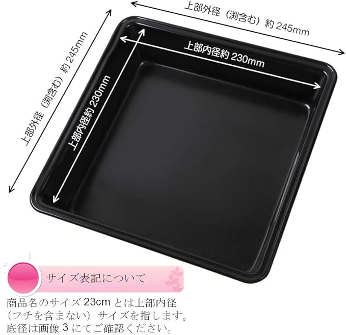 サイズ(上部外寸):245 245 高さ51mm サイズ(上部内寸):230 230 深さ50mm