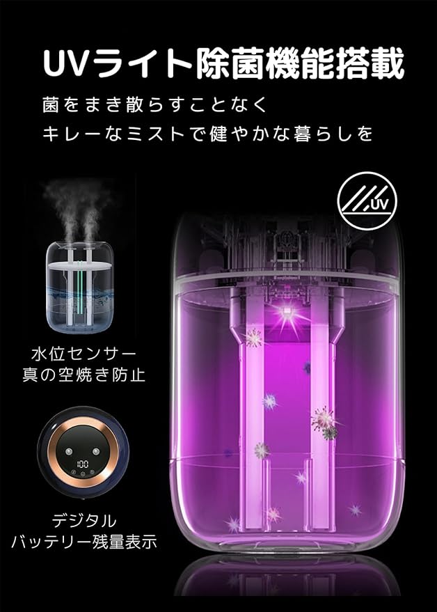 【きれいなミスト】除 菌機能を搭載しており、UVライトで照射して水中の細 菌を除去できます。水タンクは銀イオン抗 菌加工を施したので抗 菌 力UP↑ 。タンク内を常に清潔に保ち、菌をまき散らすことなく、キレーなミストで健やかな暮らしをサポートします。 さらに次亜塩素酸水対応できるから、空間除 菌・ウイルス対策にも活躍する加湿器です。