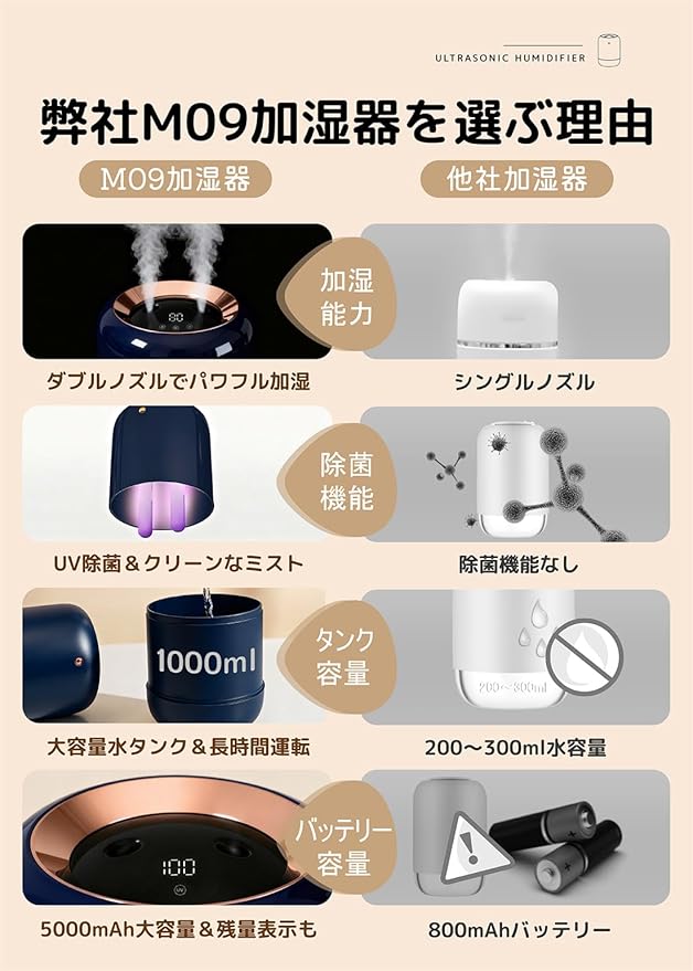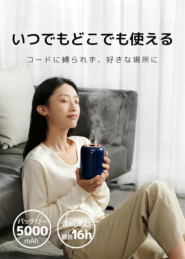 【使い勝手よい】5000mAh大容量バッテリーを内蔵する充電式加湿器なので、電源やコードの長さに縛られず、いつでもどこでも潤いの有る快適な時間を過ごせます。デスク周りをすっきりさせたい方にもおすすめです。 バッテリーが切れたときでもパソコンから電源が取れる便利なUSB給電タイプ。 一目瞭然のデジタルバッテリー残量表示が付いており、充電のタイミングを逃しません。