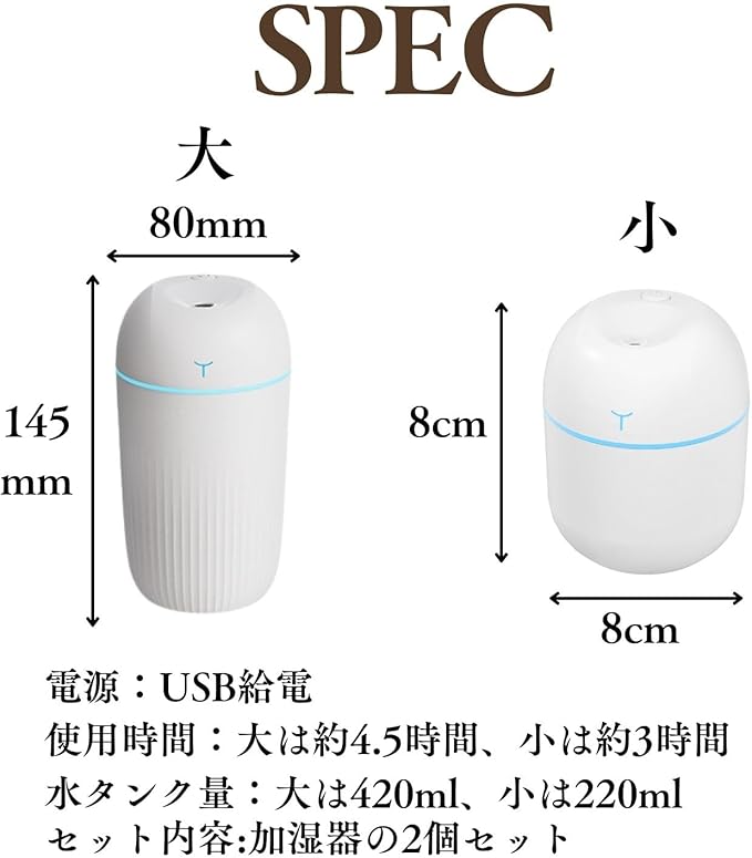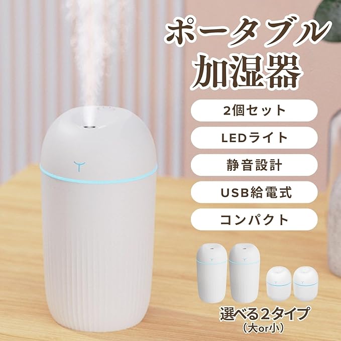CAWKAY 加湿器 2個セット ポータル 持ち運び可 小型 USB給電式 車載 卓上 オフィス リビング ベッドルーム 乾燥防止 低騒音 (ホワイト(小)2個セット)