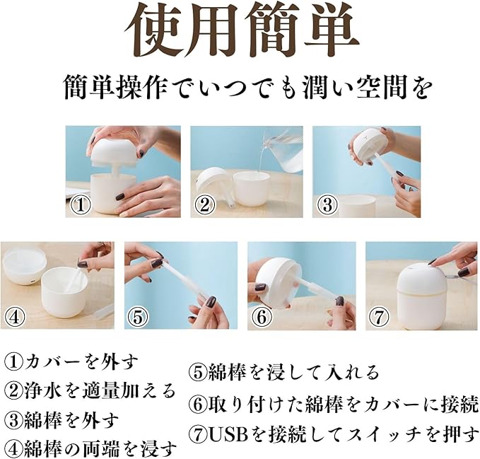 【USB給電式で環境にも優しい】 USB給電式なので、電池を使う必要がなく繰り返し利用可能。環境に優しい設計で経済的です。また、少量の水でも効率よく加湿できるので、水の使用量を抑えながら快適な保湿効果を発揮します。
