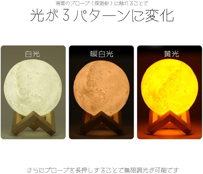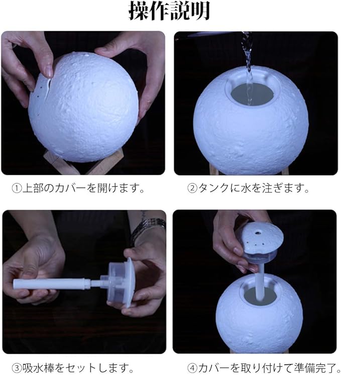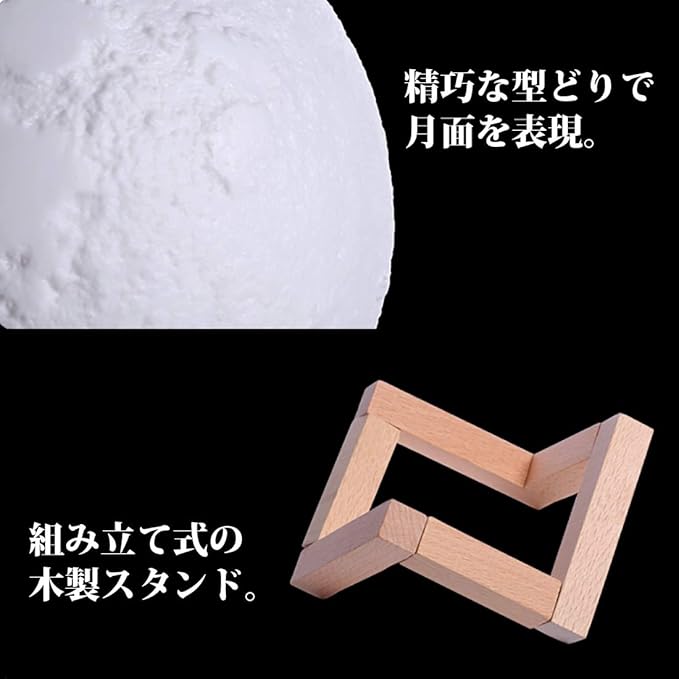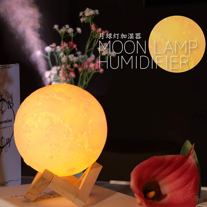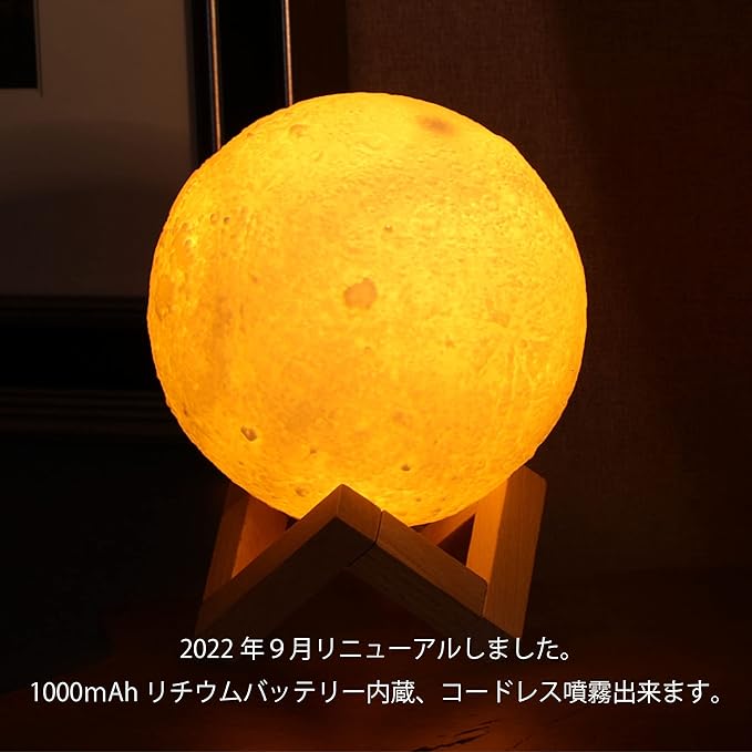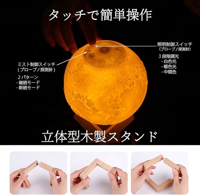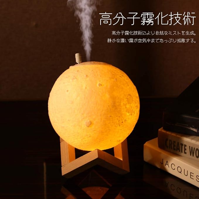 3D 月球灯 加湿器 880ml タッチ式 3段階 調光 明るさ調節 バッテリー内蔵 LED ライト 照明 小型 軽量 加湿 ミスト ナイトランプ 照明 噴射 継続 断続 木製 デスク テーブル 卓上 寝室 インテリア 雑貨 月 ムーン 月面 球体 丸形 秋 冬 ギフト